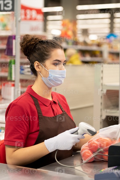 Молодой кассир в защитных перчатках и маске сканирует пакет свежих спелых помидоров