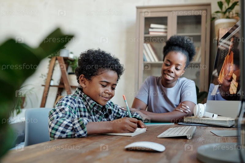 Усердный школьник делает заметки перед монитором со своим учителем на экране во время онлайн-урока