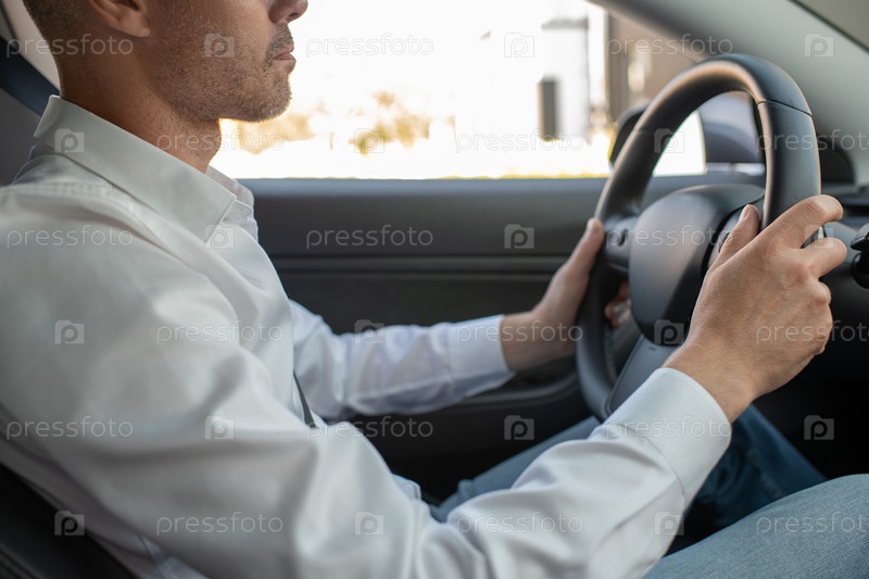 Руки молодого элегантного мужчины, держащего руль