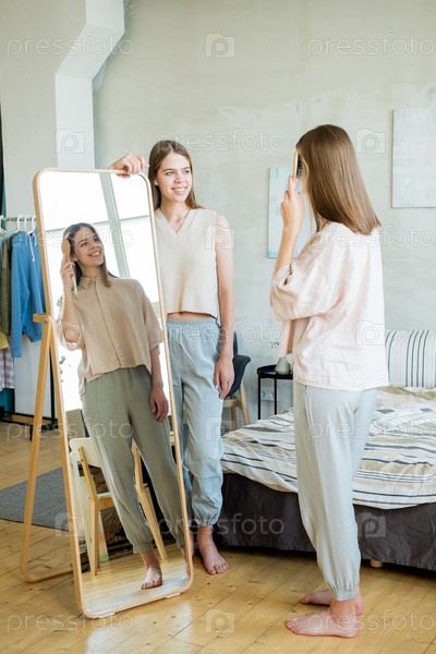 Одна из двух милых близнецов, чесающих волосы перед зеркалом