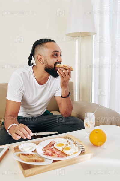 Мужчина ест завтрак