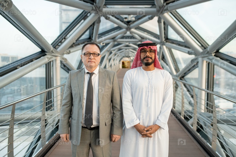Два уверенных в себе бизнесмена или делегаты, стоящие рядом друг с другом на алтаре