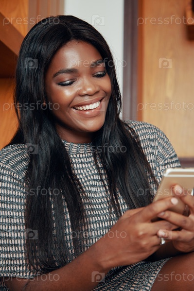 Смеющаяся женщина отправляет сообщения друзьям