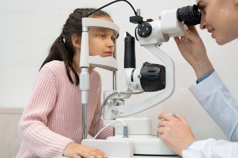 Маленькая девочка проверяет зрение с помощью современного офтальмологического оборудования