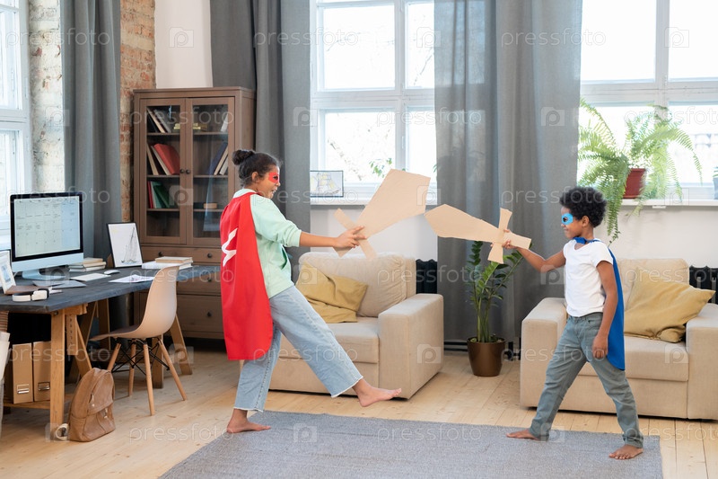 Два очаровательных брата в костюмах супергероев, играющих картонными мечами