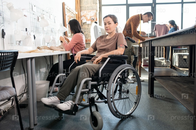 Молодая портная в инвалидном кресле