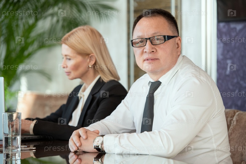 Зрелый деловой делегат сидит за столом против своей элегантной блондинки-секретаря
