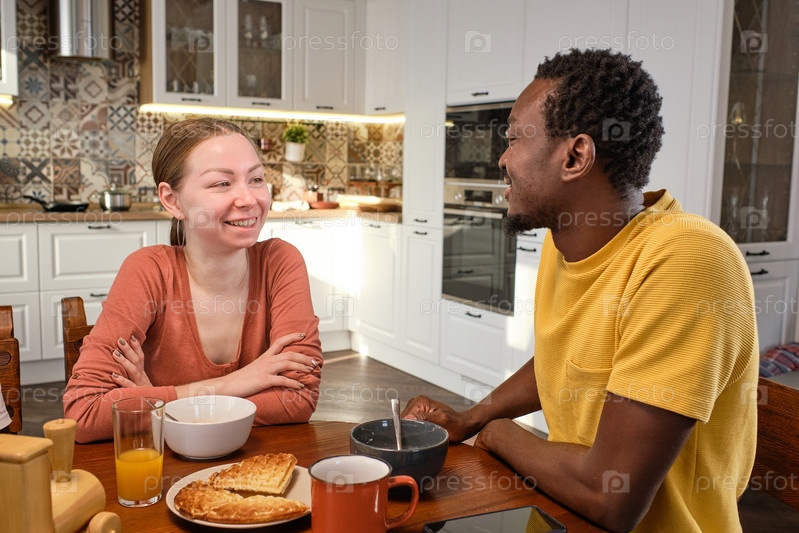 Счастливая молодая межкультурная пара, беседующая за завтраком