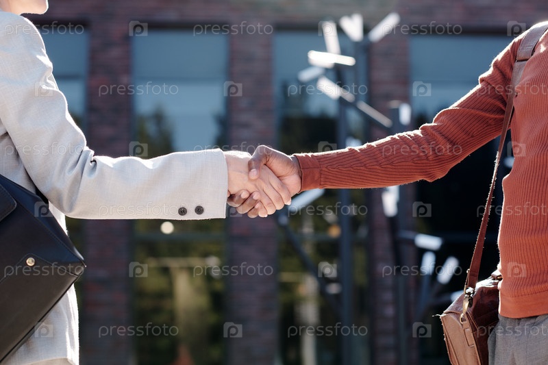 Мужчина и женщина в умной повседневной одежде рукопожатия
