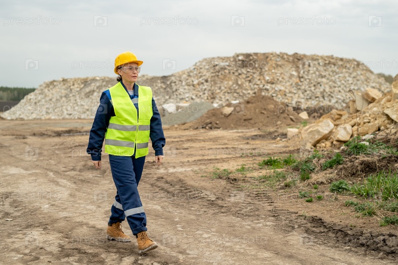 Уверенный работодатель в рабочей одежде, движущийся по дороге на строительной площадке