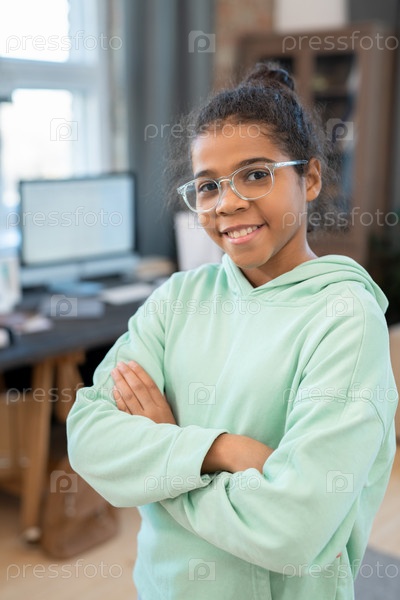 Молодая девушка смешанной расы в повседневной одежде и очках, скрестившая руки на груди