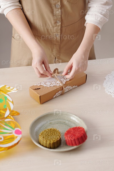 Женщина, украшающая коробку с лунными пирожками