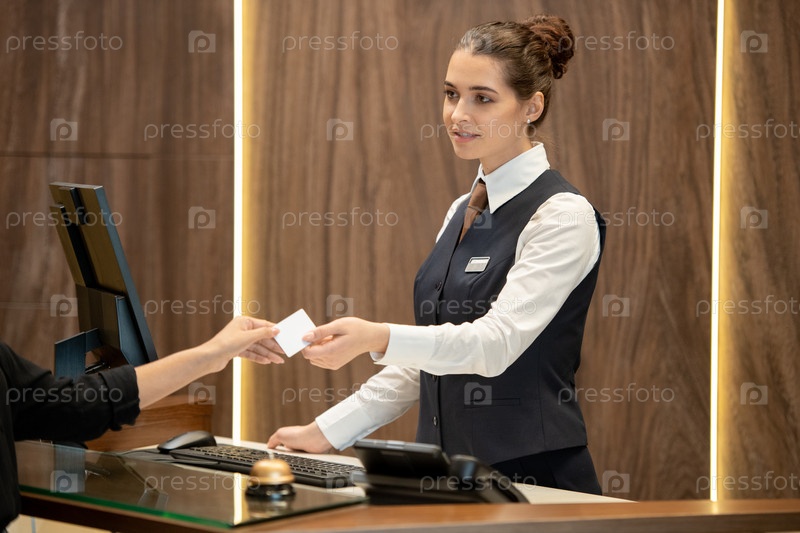 Молодая женщина-рецепционера передает путешественнику белую пустую карточку