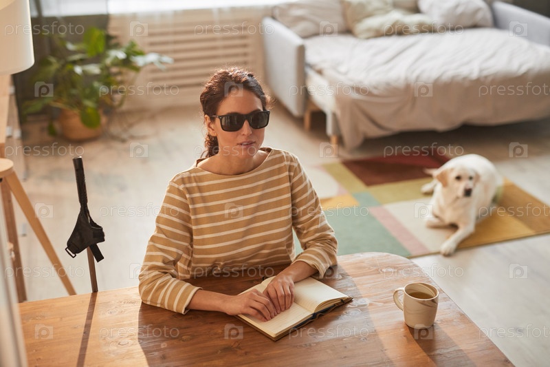 Молодая слепая женщина читает книгу дома