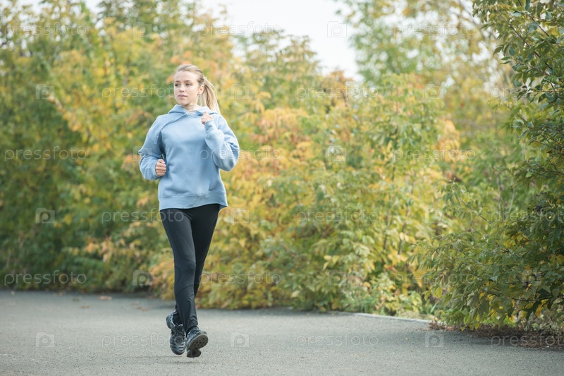 Молодая блондинка спортивная женщина в активной одежде бегает по дороге в парке среди деревьев