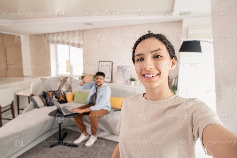 Счастливая женщина делает селфи со своим мужем на заднем плане