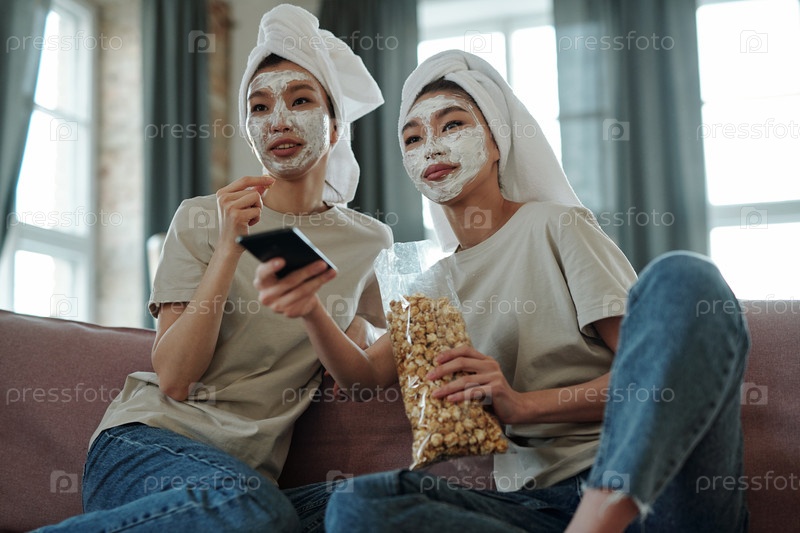 Молодые азиатские близнецы сидят на диване, смотрят фильмы и едят попкорн