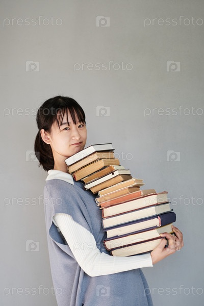 Портрет озадаченной азиатской студентки в трикотажном жилете, несущей большую кучу книг на изолированном фоне