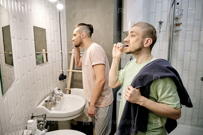 Два молодых гея чистят зубы в ванной
