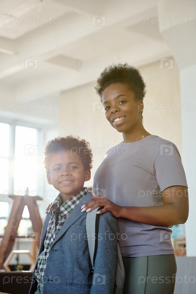 Счастливая молодая бережная мать держит руки на плечах своего маленького сына с рюкзаком