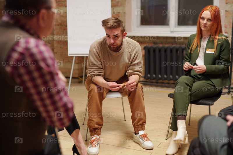 Молодой человек и женщина слушают старшего пациента мужского пола