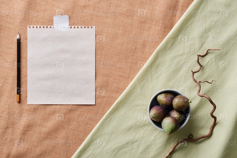 Высокоугольный вид листа бумаги как места для записок, карандаша, ветки и инжира в миске на коричневых и светло-зеленых тканях