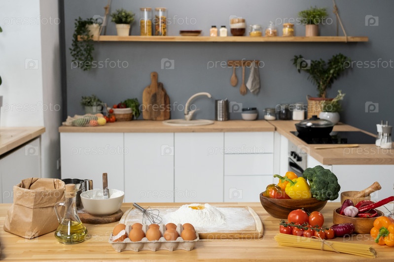 Интерьер кухни с столом и свежими овощами