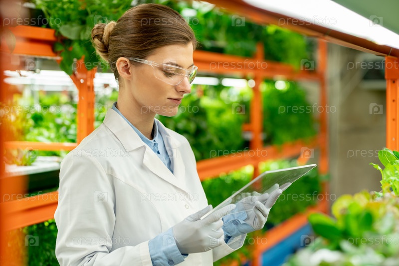 Молодой сельскохозяйственный инженер использует стеклянную панель