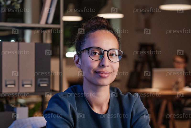 Портрет улыбающейся привлекательной молодой бизнес-жены в очках, сидящей на полках офиса