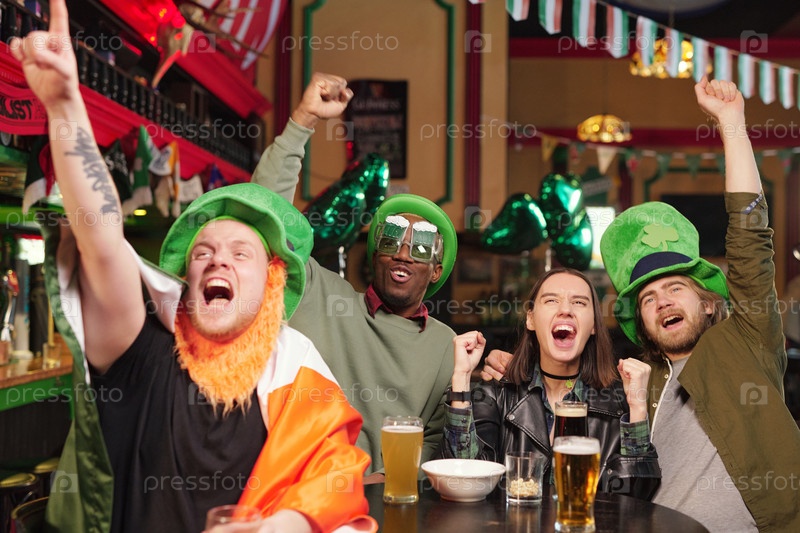 Группа молодых взволнованных футбольных фанатов, выражающих триумф во время игры