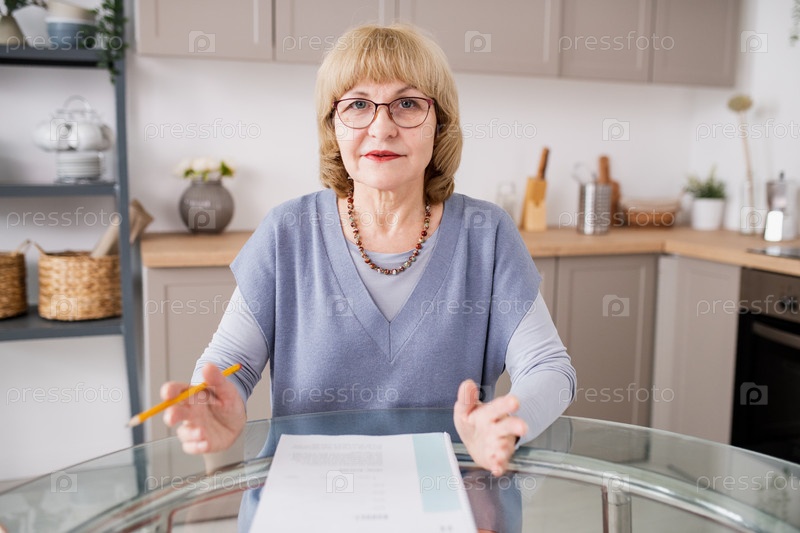 Блондинка-учительница в повседневной одежде и очках объясняет что-то онлайн аудитории