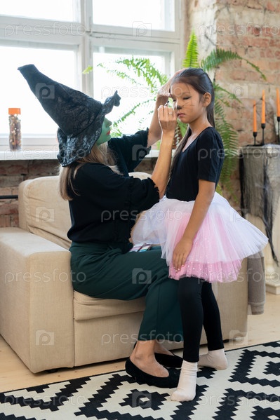 Молодая женщина в черном костюме ведьмы наносит макияж на глаза маленькой девочки