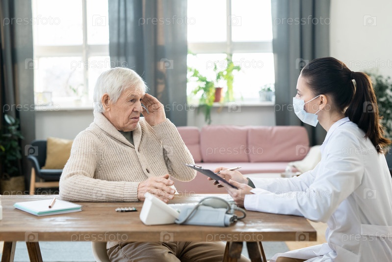 Больной старший мужчина касается головы и смотрит на молодую женщину-врача в белом халате