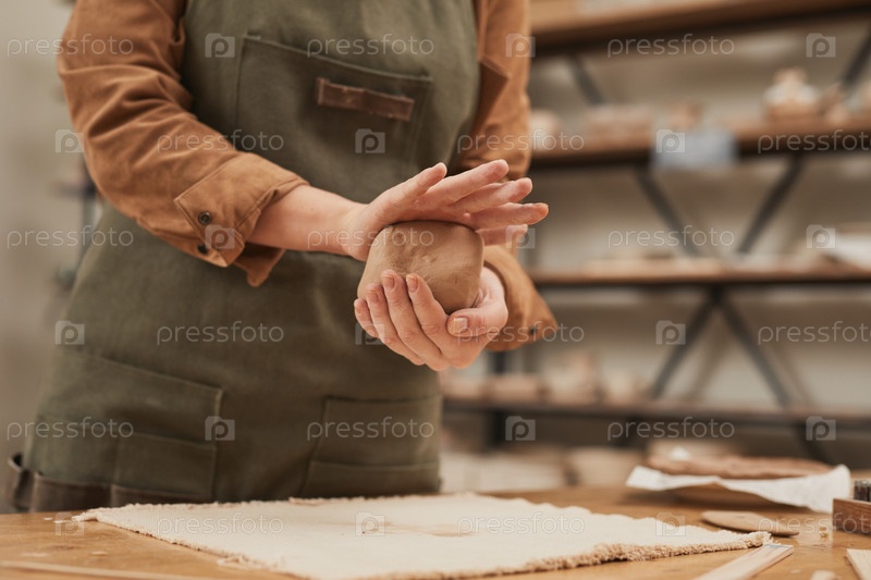 Женская горшечник, формирующий глину Close Up
