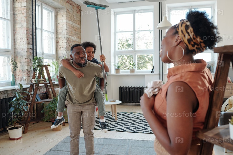 Молодая африканская женщина с пылесосом стоит у полок в гостиной и разговаривает со своим мужем