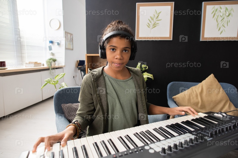 Серьезная афроамериканская школьница сидит у клавиатуры пианино