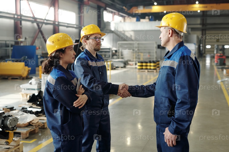 Инженеры приветствуют друг друга рукопожатием в мастерской с коллегой-мужчиной, стоящей рядом