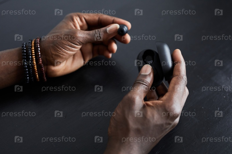Мужчина использует беспроводные наушники, чтобы слушать музыку