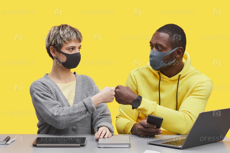 Креативная бизнес-команда бьет кулаками в жёлтый