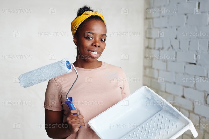 Молодая африканская женщина с пайнтроллером стоит в углу против двух стен во время ремонта дома