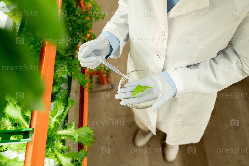 Перчатый агроинженер в белом пальто, держащий чашу Петри с зеленым листьем салата