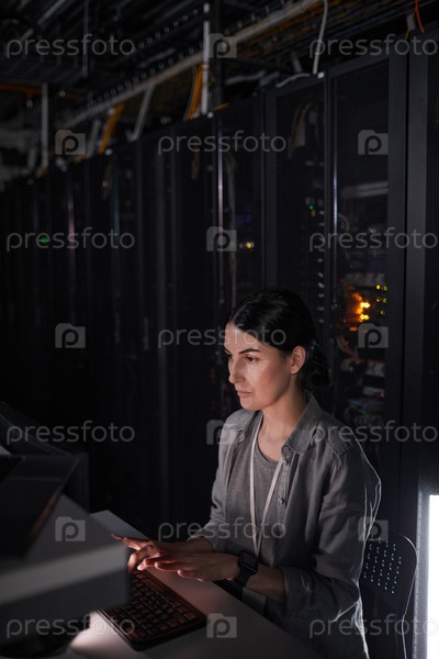 Молодая женщина, использующая компьютер в серверной комнате