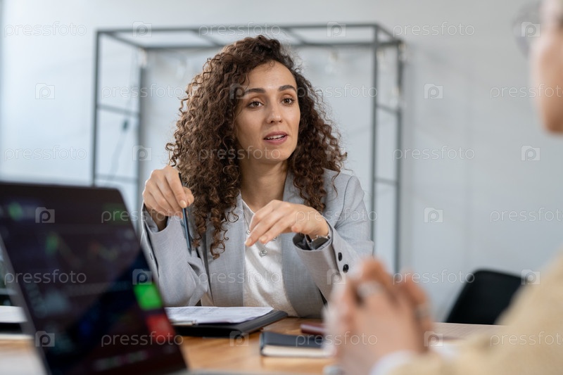 Уверенная в себе деловая женщина объясняет один из рабочих пунктов
