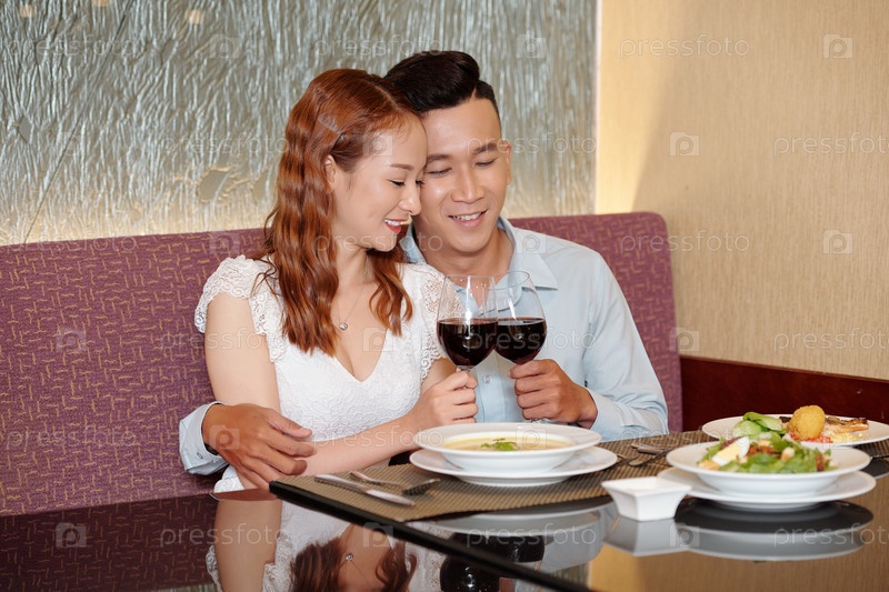 Пара обнимается за столом в ресторане