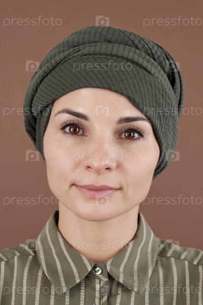 Лицо молодой мусульманки в головном уборе и полосатой рубашке