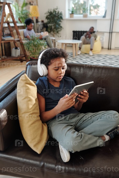 Милый мальчик с наушниками сидит на черном кожаном диване и смотрит онлайн видео