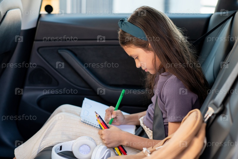 Милая школьница рисует цветными карандашами