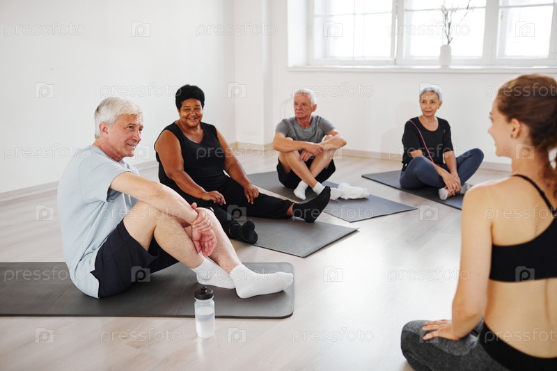 Пожилые люди практикуют йогу в студии