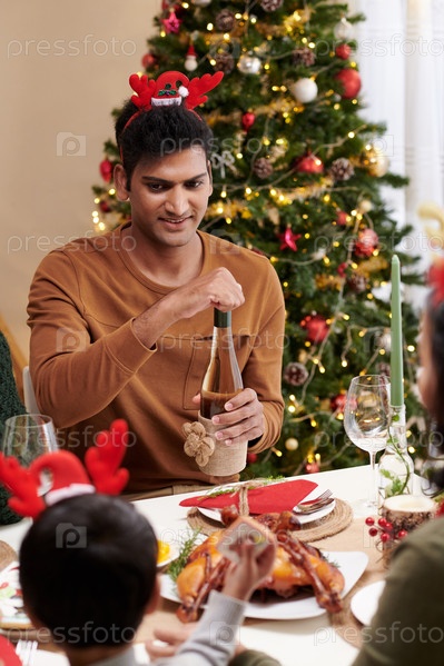 Мужчина, открывающий бутылку вина за ужином