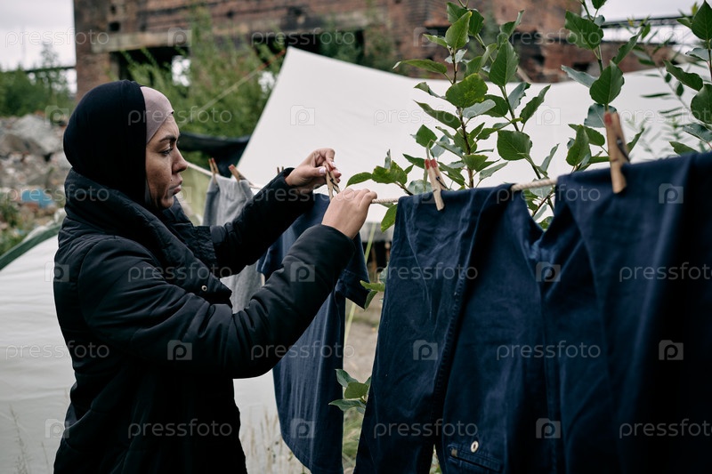 Молодая женщина-мигрант вешает чистую одежду на веревке
